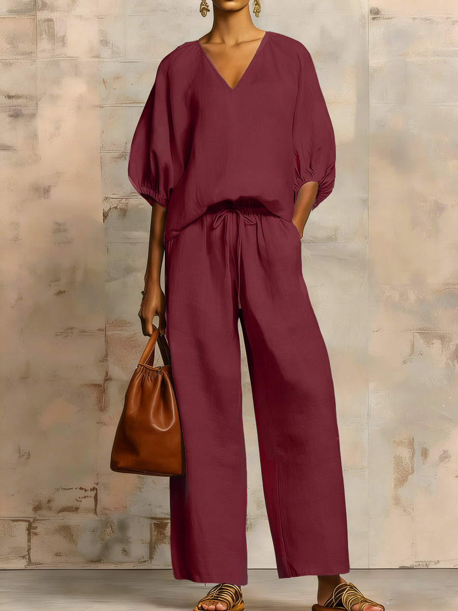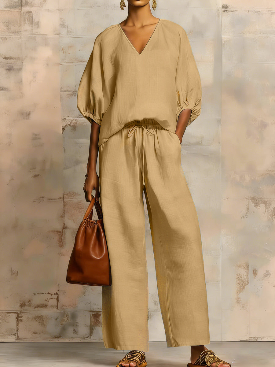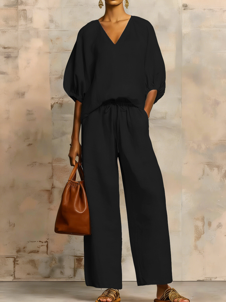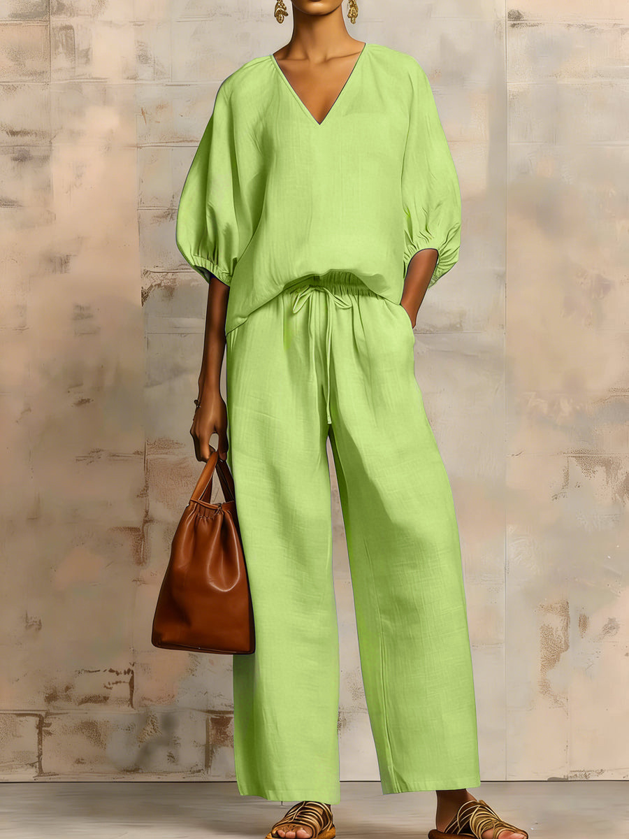 Womens Loose Solid-Colored V-Neck Half-Sleeve Top And Wide-Leg Pants Set